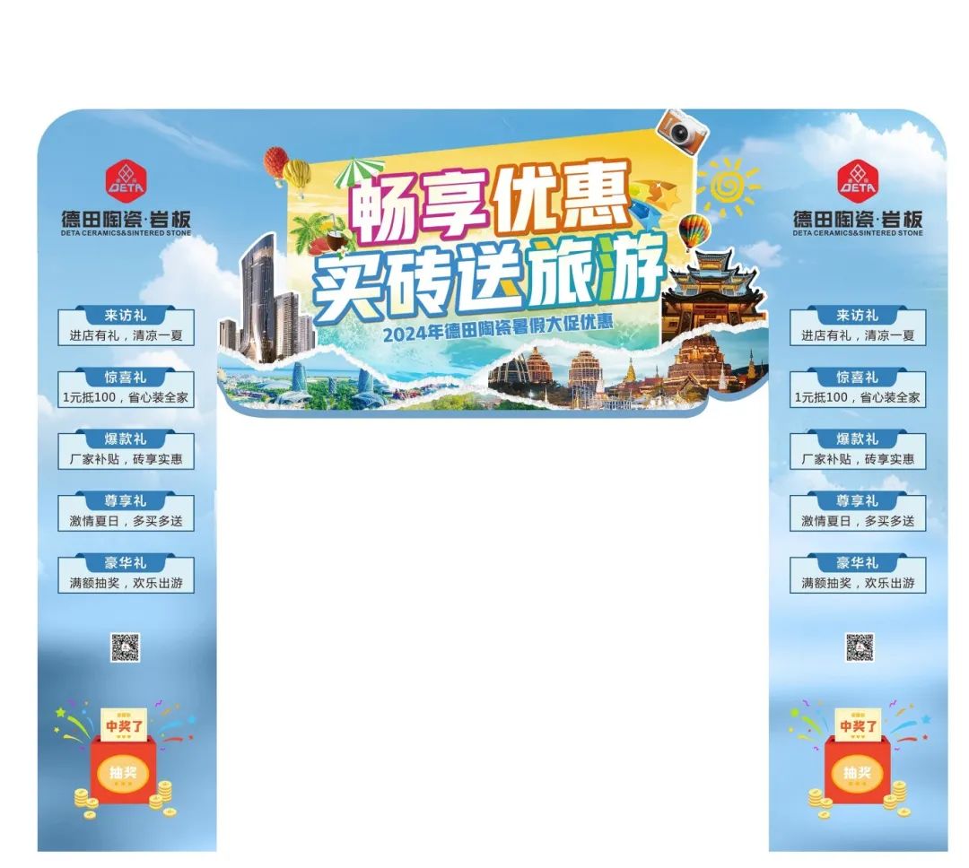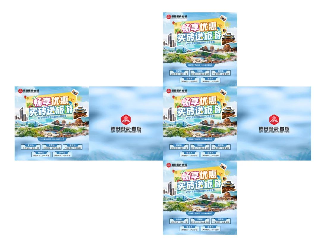 為了迎接暑期銷售旺季節(jié)點(diǎn),更好地配合廣大經(jīng)銷商家人們開展促銷活動,營造濃郁的促銷氛圍,搶占市場,德田陶瓷發(fā)起“暢享優(yōu)惠,買磚送旅游”暑期促銷活動,并推出系列促銷方案及物料,含拱門、單張、展架、貼紙等整套源文件。